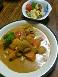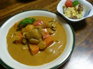 ①鶏もも肉1枚(200~300g)を1口大に切り、プレーンヨーグルト 300g、にんにく、しょうが各1片すりおろし、カレー粉大さじ3、塩小さじ2/3を混ぜた中に30分ほど漬けこんでおく。