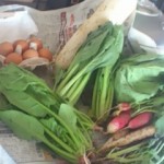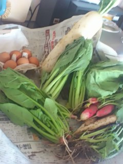 キャベツ、大根、からし菜、水菜、ラディッシュ、ほうれん草、小松菜、平飼い卵。