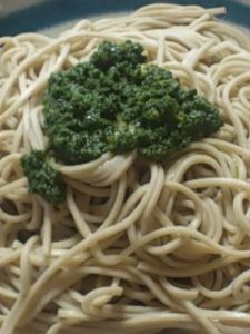 お好みのパスタ(私は麻の実入りが好きでこれを使用)を茹でて、あしたばソースを大さじ2ほど絡めるだけで