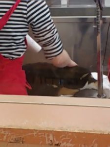 スタッフさんに抱っこされて、流し台に入れられポカーンとしている姿です。