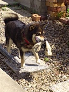 見知らぬ工事の人が自分のエリアに入ってくるのを、超絶にしっぽを振りお気に入りのおもちゃのロープをくわえて大歓迎って、太郎、キミ、犬としてどうなの・・・?