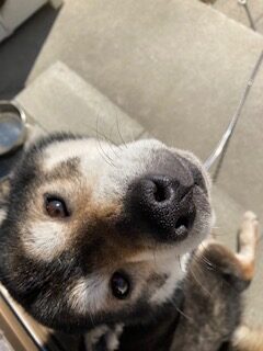 お散歩後、ポカポカ陽気のなか日向ぼっこしている太郎Jr.。(カメラ目線。鼻、近すぎ。)