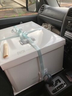 ちなみに、ケーキの大きさはこのサイズ!(助手席のシートからはみ出てる)